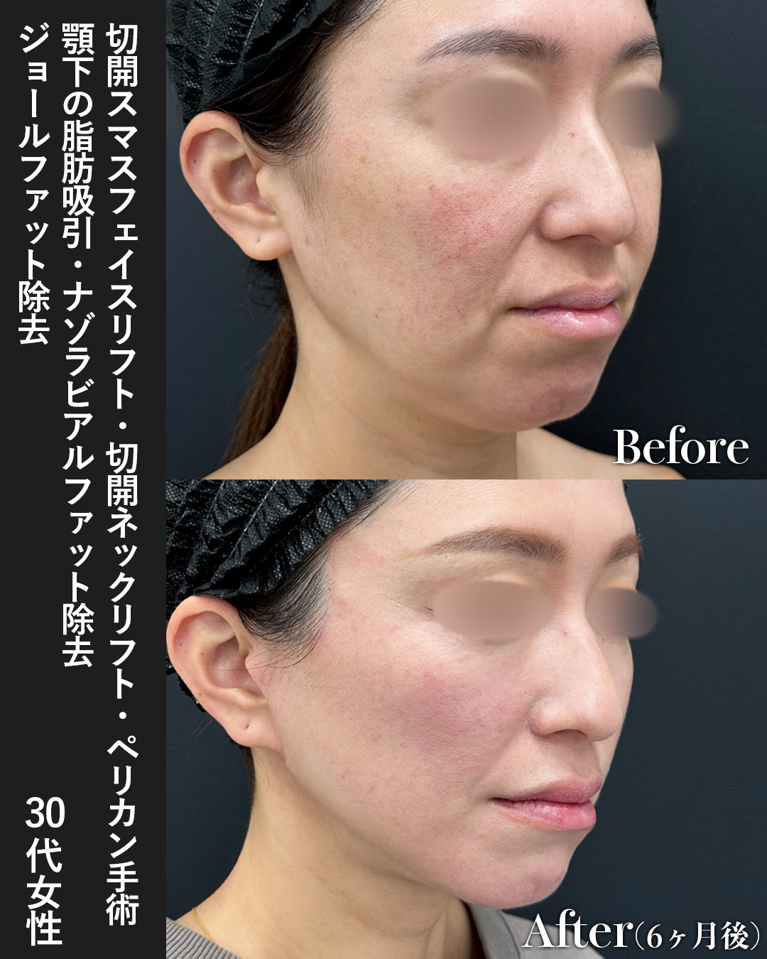 30代の方:切開スマスフェイスリフト・切開ネックリフト・ペリカン手術・顎下の脂肪吸引・ナゾラビアルファット除去・ジョールファット除去